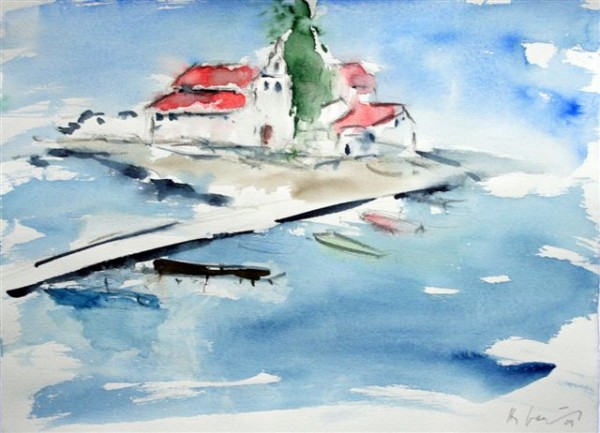 Obwohl auch hier der Tourismus sehr zugenommen hat, ist ein Ausflug auf die Halbinsel Kanoni durchaus lohnenswert. Ihr Name leitet sich von einer an ihrem Aussichtspunkt aufgestellten Kanone aus dem frühen 19. Jahrhundert ab. Der Aussichtspunkt mit seinen Cafés bietet eine großartige Sicht auf das Klosterinselchen Vlacherna und die Mäuseinsel. Diese zauberhafte Ansicht zählt mit Recht zu den eindrucksvollsten Bildmotiven Korfus. Zu dem Klosterinselchen führt ein Damm, während die Mäuseinsel mit kleinen Ausflugsbooten zu erreichen ist.Größe ca. 60 cm x 40 cm (Auf Wunsch sind auch andere Größen möglich)